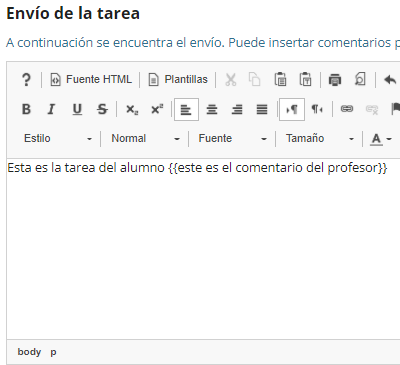 Envío de la tarea: podemos añadir comentarios directamente en la tarea enviada por el estudiante. Los comentarios que hagamos, para diferenciarlos mejor, debemos hacerlos entre doble corchetes, de esta manera se mostrarán en rojo: