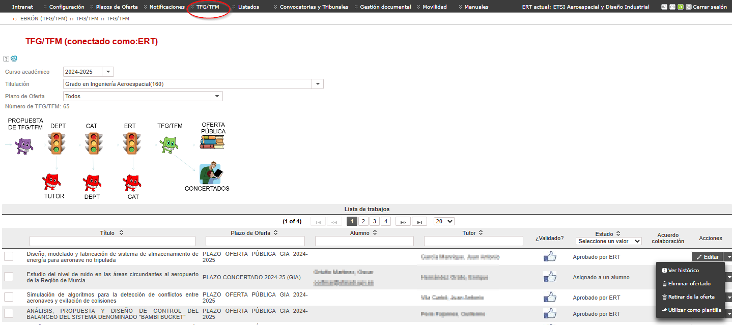 Desde esta opción la ERT tiene la posibilidad de dar de alta propuestas de TFG/TFM y una vez finalizados los plazos definidos, validar y gestionar las propuestas de los trabajos.
