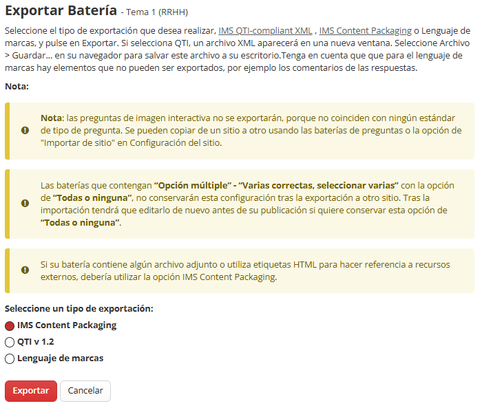 En la herramienta "Exámenes", se permite la exportación e importación directa para las baterías de preguntas.